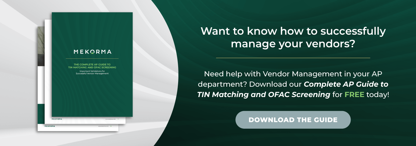 Mekorma Vendor Validation automatically verifies Tax Identification Numbers (TIN) and checks the Office of Foreign Assets Control (OFAC) sanctions list, so you don’t have to.